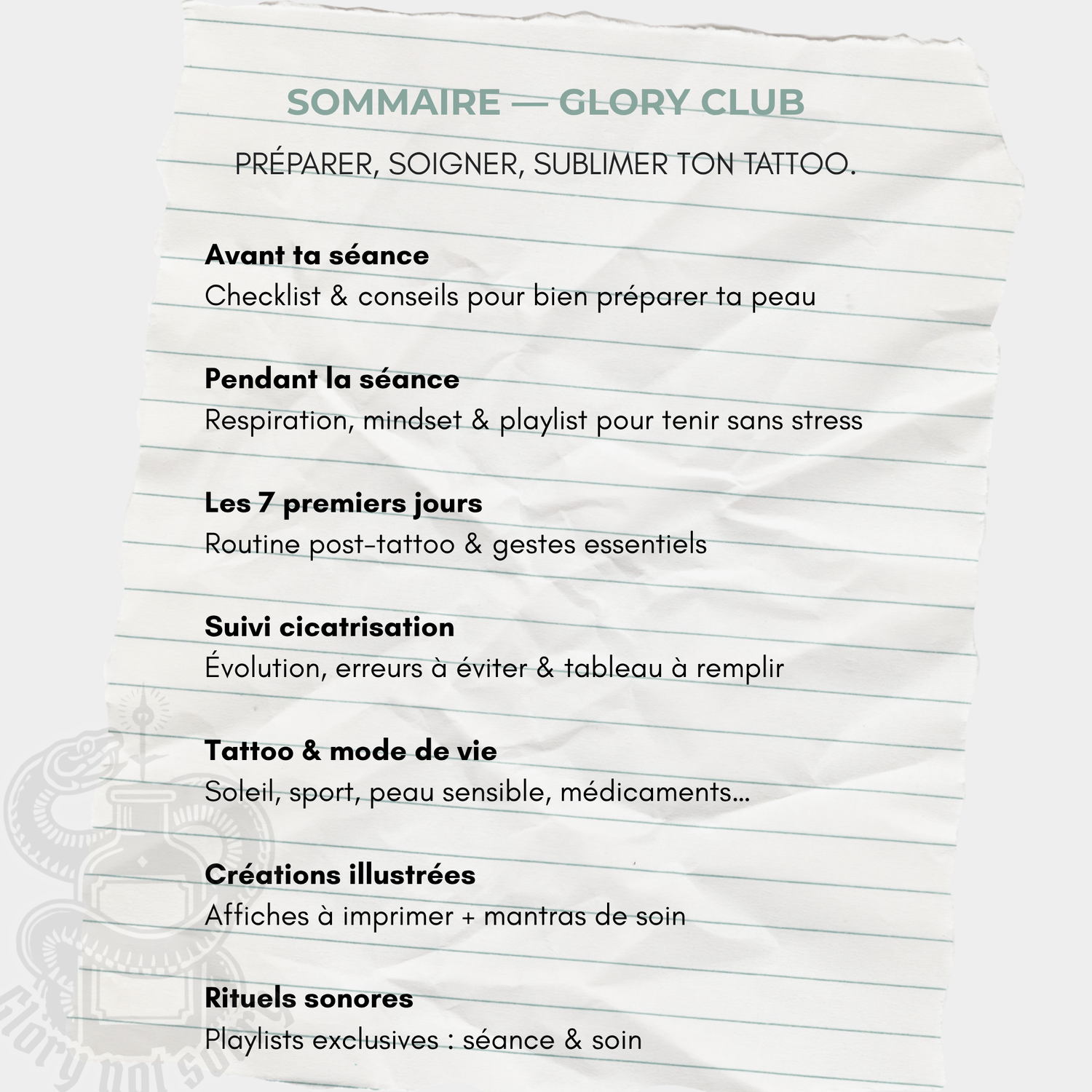 Ton tatouage, tu l’as choisi avec soin. Le Glory Club t’aide à l’honorer comme il se doit. Avant ta séance, il t’aide à te préparer. Pendant, il t’accompagne en douceur. Après, il te guide étape par étape.