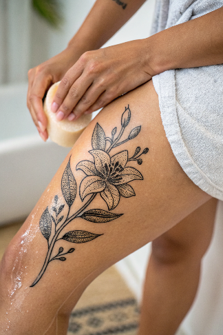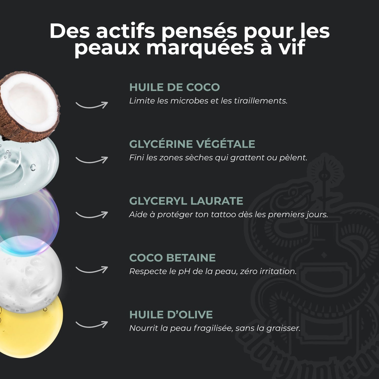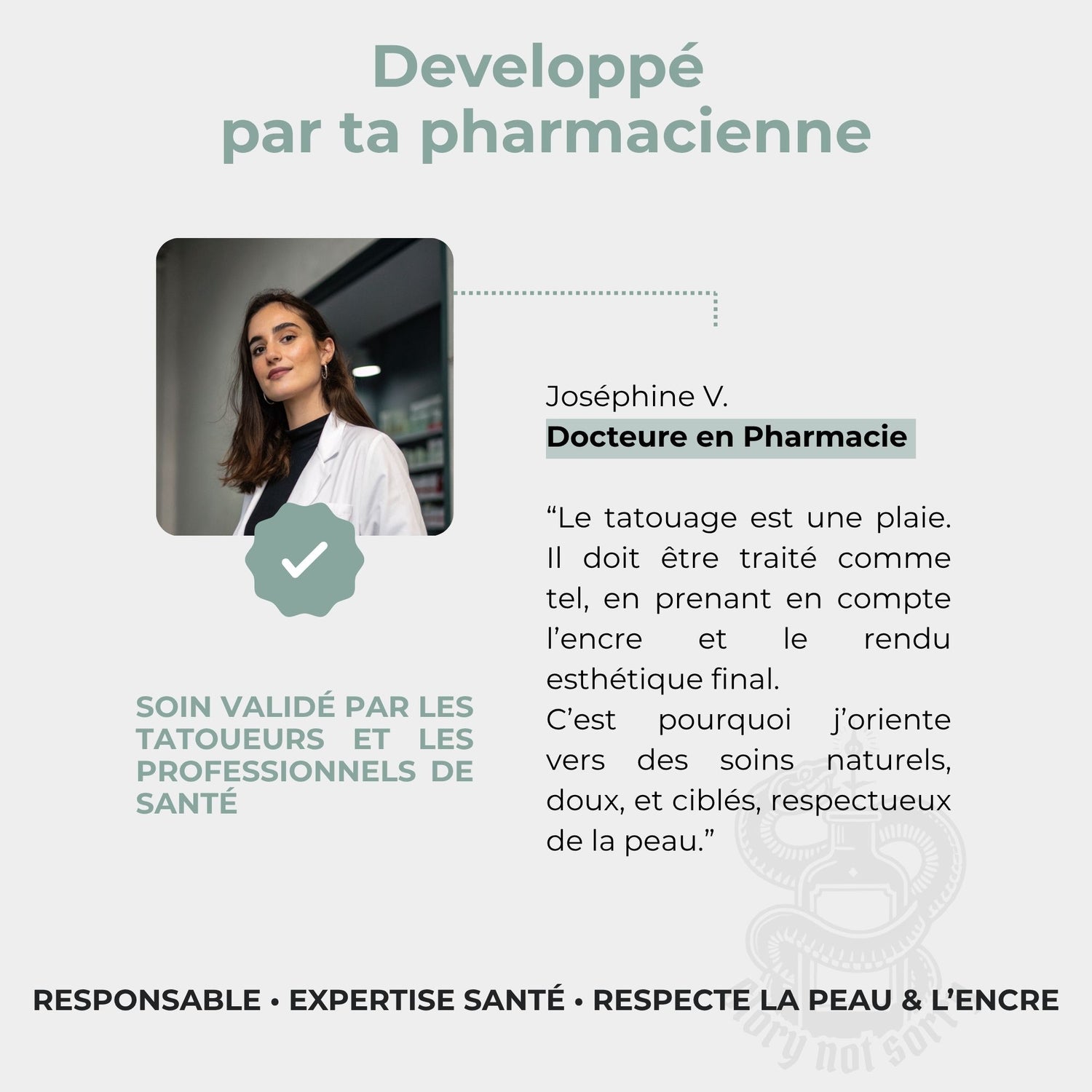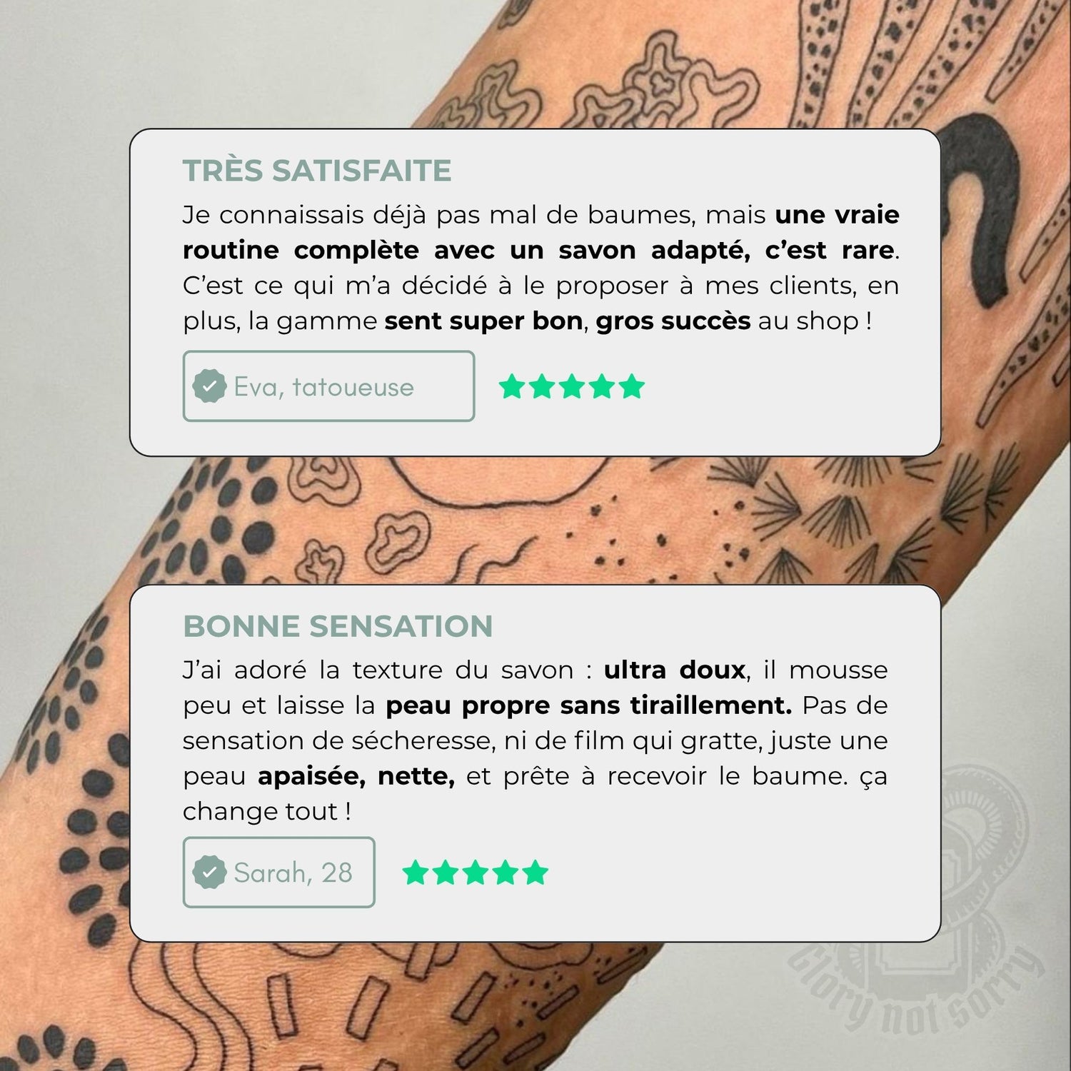 “Un tatouage, c’est une plaie ouverte qui mérite un nettoyage ultra-doux. Un bon savon post-tatouage évite les croûtes épaisses, les démangeaisons, et protège la finesse du tracé.” - Docteure en Pharmacie