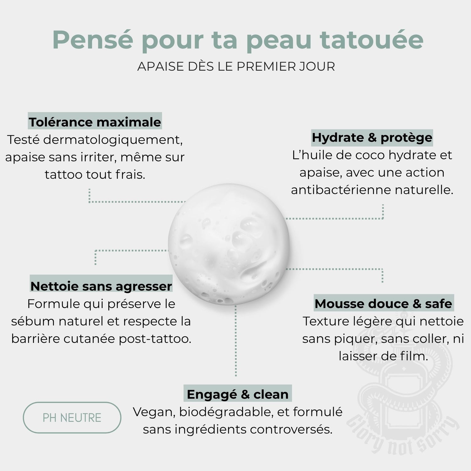 Fais mousser dans tes mains mouillées, puis applique délicatement sur ton tattoo. Rince à l’eau tiède, sans pression, et sèche en tapotant avec une serviette propre.